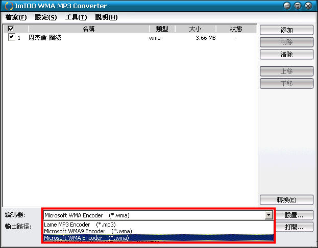 選擇編碼器 Lame MP3 Encoder (*.MP3) 若要將MP3轉換為WMA則須選擇 Microsoft WMA9 Encoder(*.wma)或 Microsoft WMA Encoder(*.wma)